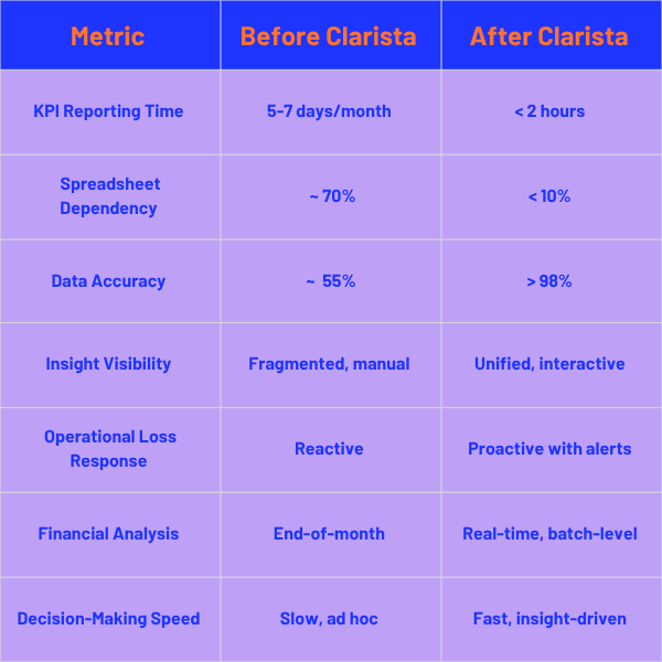 With Clarista, Encube’s finance team now gets answers in hours—not days. Instead of preparing data, they’re using it. Pricing changes, production tweaks, and margin improvements are backed by live batch-level insights. Clarista turned a reactive reporting loop into a proactive decision engine.